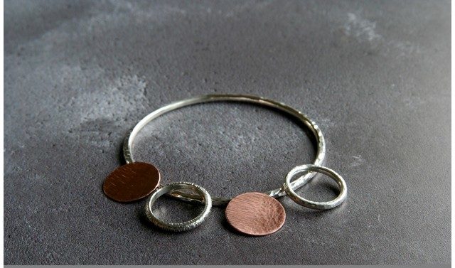 You will learn how to use a saw to cut simple shapes from silver – circles/teardrops etc. Then, using a range of different hammers, you will explore how to create different textures on the metal surface. Once you have some basic techniques, you will have the choice of making either a ring or bangle in copper. Once you have worked through the process in copper and feel confident, you will have the chance to replicate the design in silver. Alternatively, if you prefer, you can create a small charm to be added onto your copper bangle by saw piercing out a design of your own and adding texture.