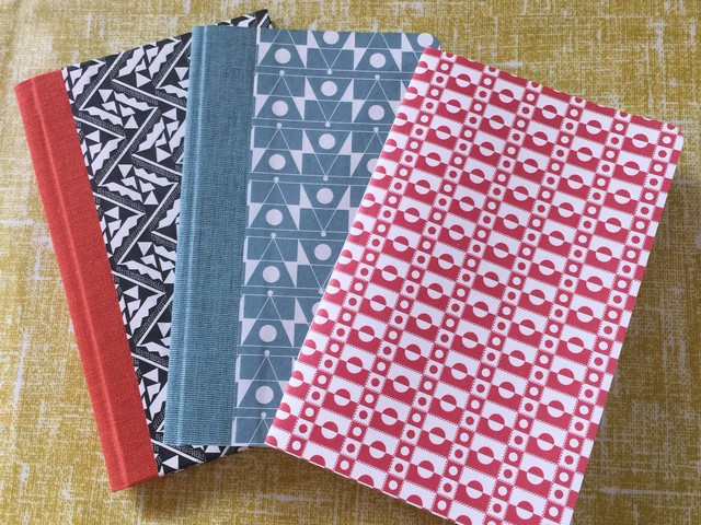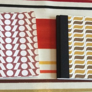 – A single section hardback notebook. Quarter bound in cloth, paper sides and case bound with ‘squares’ (little lip round the edge).