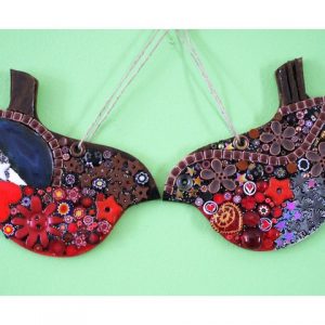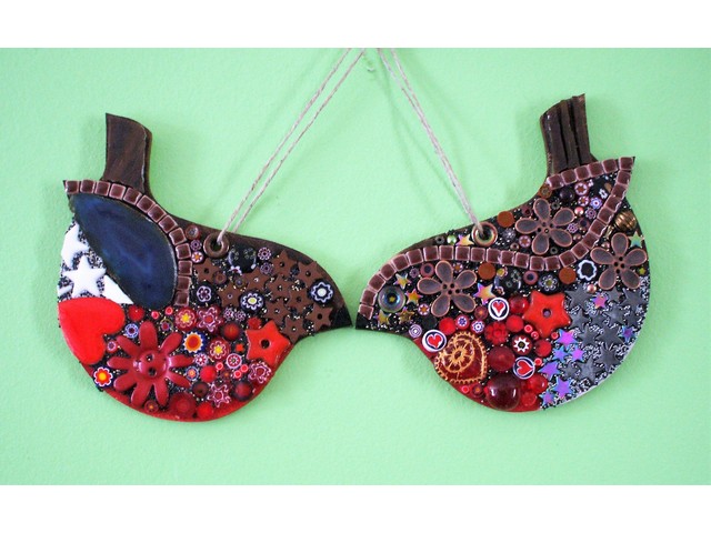 Create your own 2 resident robins to hang on your tree, mantelpiece or window using a mixture of patterned, textured and varied materials such as beads, millefiori, buttons, ceramic, glass, etc.