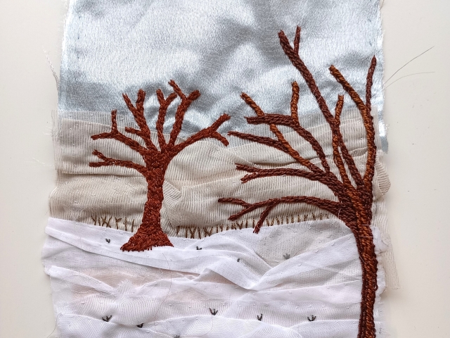 Be inspired by the wintry seasonal landscapes that surround us and learn how to create a stunning hand stitched and embroidered textile landscape, with Textile artist, Louise Goult. Inspired a place you love, or an imagined landscape, you will learn how to select fabrics and place them to create a background for your landscape. You will then learn how to add details. You will use a range of hand embroidery stitches, make best use of a variety of of threads and learn options for embellishments if you would like to use them.