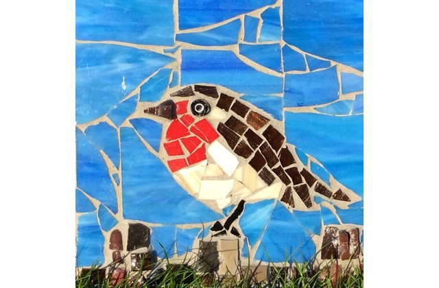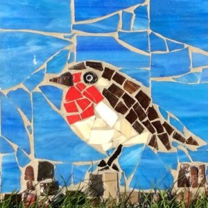 You will create lively and vibrant mosaic piece featuring a festive Robin on a 6” x 6” mosaic tile on a wooden base board inspired by using a range of stained glass and sparkly mirror glass. The workshop will include: