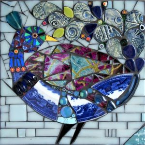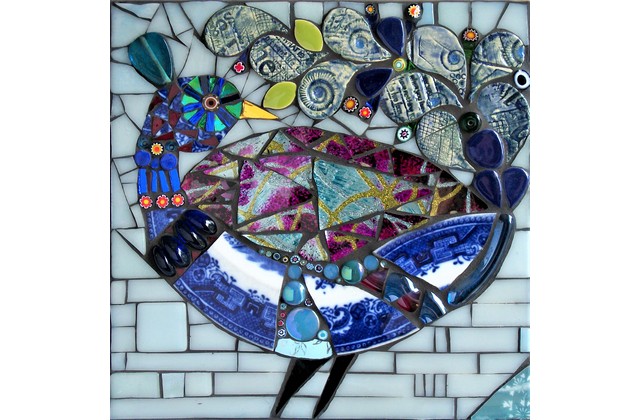The Peacock is a stunningly beautiful bird of richly riotous colours, often symbolising eternal life, good luck and prosperity. Create your very own mosaic Peacock using a glorious variety of shimmering mirror / iridescent/ glitter glass and other twinkly, sparkly ephemera…the more outrageous, the better!