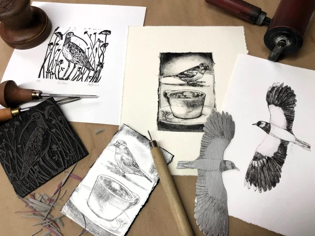 Join the printmaking revolution and learn how to create your own repeat images. On this one-day workshop you’ll explore relief and intaglio techniques through drypoint and linocut. You will discover how to use recycled materials as printmaking plates, what household items can be used in place of a press, explore different surfaces for relief printing and what inks will clean up with minimum effort. The methods are direct and fun whilst producing professional results. Explore what type of papers will give you the wow factor and experience the excitement that comes from revealing the first prints of your own designs.
