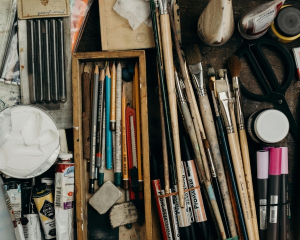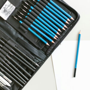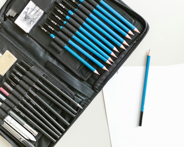 A couple of pencils 2b, 3b. A pencil sharpener and erasure. A couple of black fine liner pens.