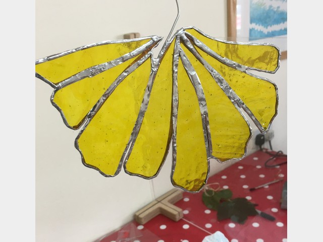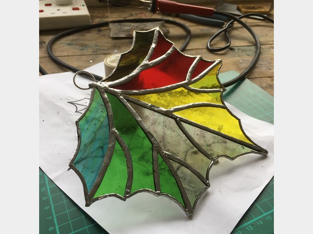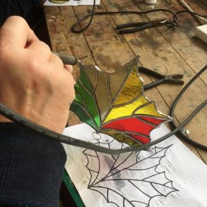 During this one day workshop you will make a small selection of copper foil leaf decorations. You will learn to cut glass, foil and solder them, and finish them off ready for hanging in the window or even outside on a tree!