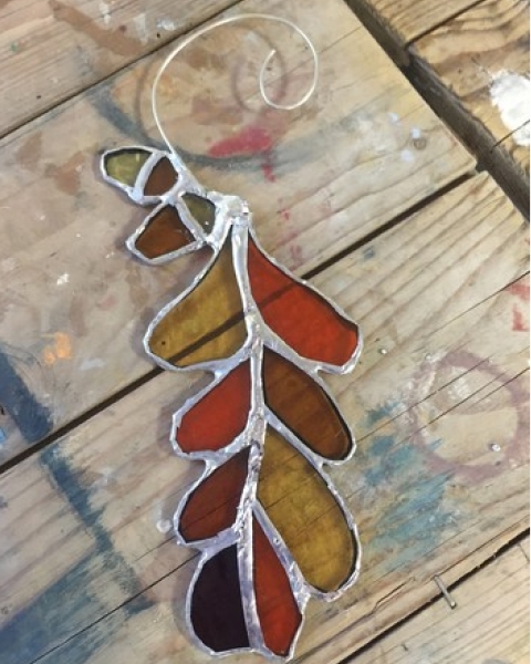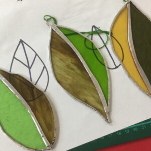During this one day workshop you will make a small selection of copper foil leaf decorations. You will learn to cut glass, foil and solder them, and finish them off ready for hanging in the window or even outside on a tree!