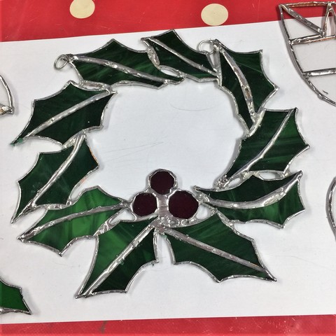 During this one day workshop you will make a small selection of copper foil leaf decorations. You will learn to cut glass, foil and solder them, and finish them off ready for hanging in the window or on your Christmas tree!