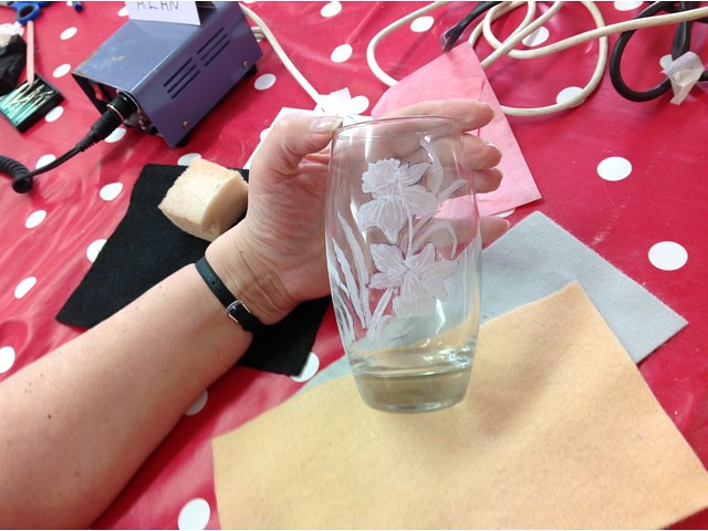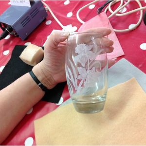 There will be a selection of different shaped glasses to choose from, and Sandra will guide you through how to use a drill safely. She will have a range of templates to choose from if needed and will help you to match your design to the shape of your glass, transferring the design to your glass using a variety of techniques, and experimenting with different burrs to achieve the desired textured effect on the glass.